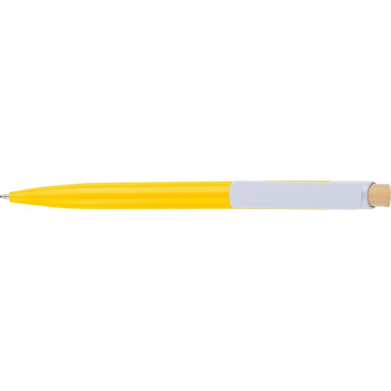 Długopis, bambusowy przycisk, metalowy klips, wkład w niebieskim kolorze, ikona recyklingu na produkcie, wystarcza na ok. 600 m pisania, produkt wykonany z ABS z recyklingu, aluminium i bambusa