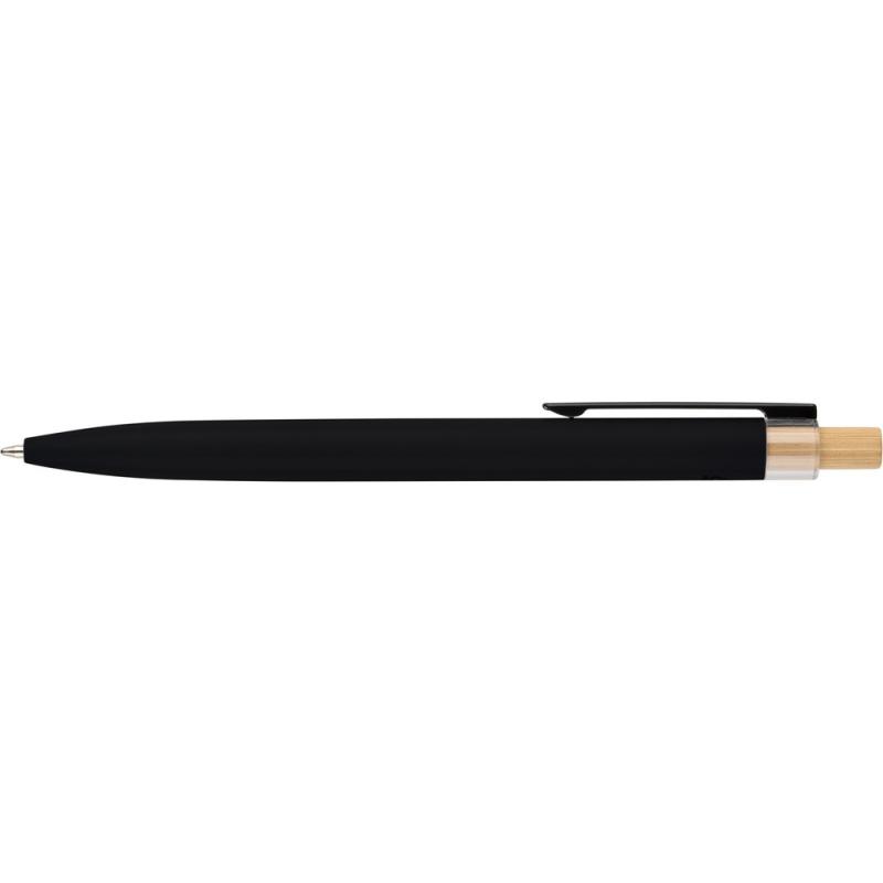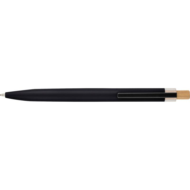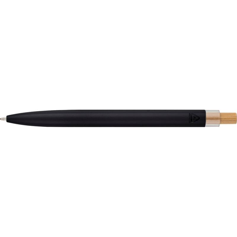Długopis, wkład w niebieskim kolorze, wystarcza na ok. 700 m pisania, ikona recyklingu na produkcie, produkt wykonany z aluminium, RPET i z przyciskiem z bambusa