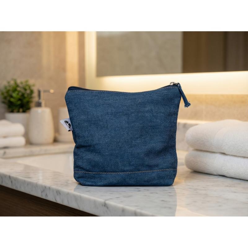 Kosmetyczka, kieszeń zapinana na zamek, ikona recyklingu na metce, produkt wykonany z denimu z recyklingu
