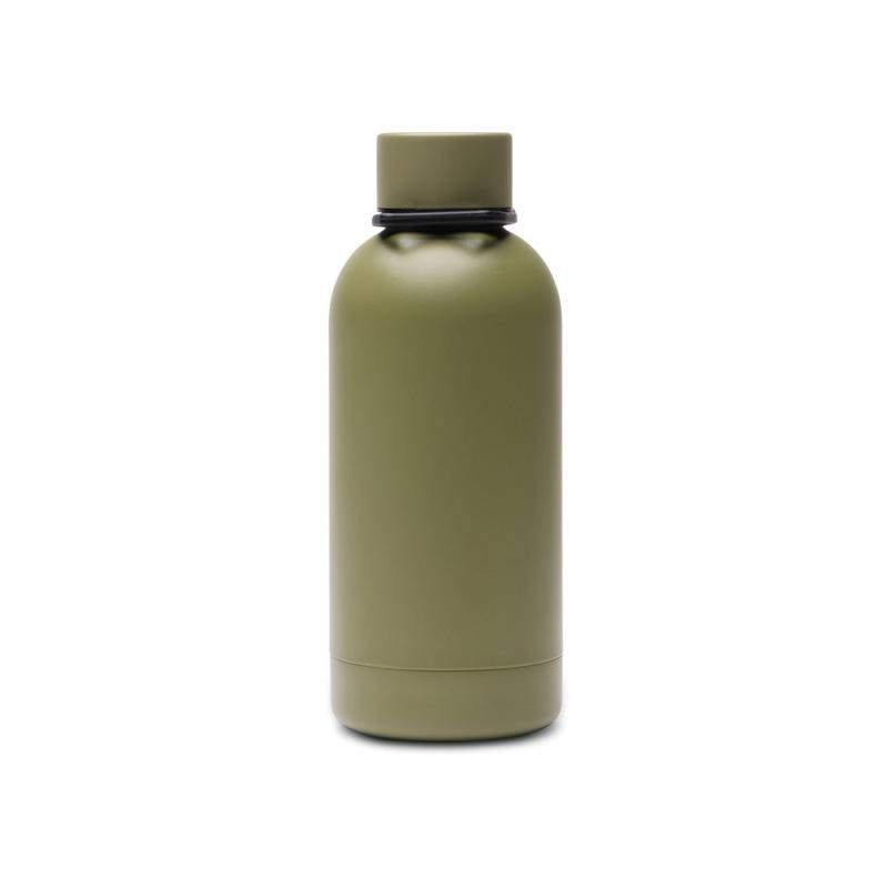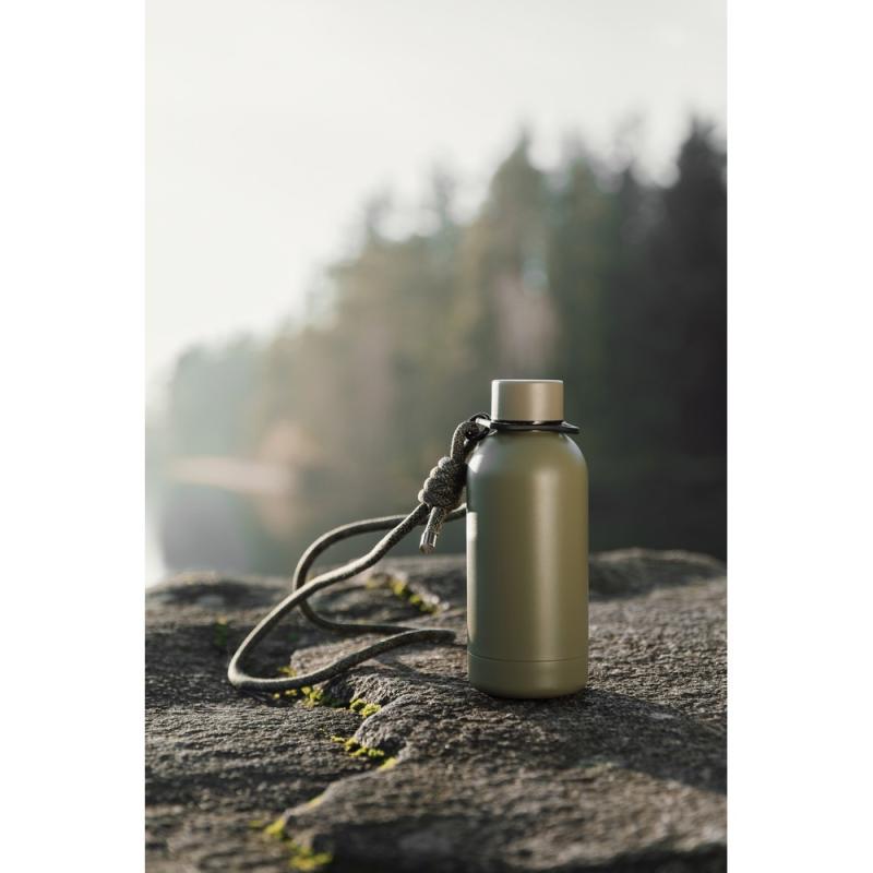 Butelka termiczna 400 ml, posiada podwójne ścianki ze stali nierdzewnej z recyklingu z próżnią między ściankami, co spowalnia oddawanie temperatury na zewnątrz, zachowując funkcje termosu, posiada odpinany pasek do noszenia, wykonana ze stali nierdzewnej z recyklingu, całkowita zawartość materiałów z recyklingu obliczona na podstawie masy całkowitej produktu: 71%