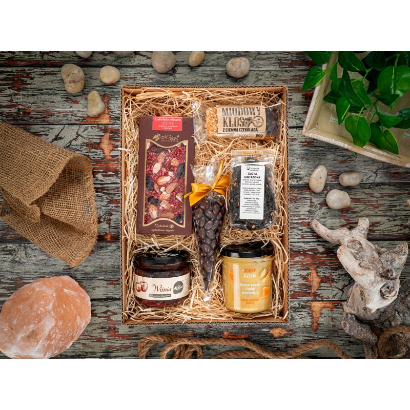 W przypadku braku dostępności produktów z oferty zastrzegamy sobie prawo do zamiany produktów na równowartościowe; zawsze po wcześniejszej akceptacji przez Klienta. Zestaw prezentowy Zmysłowe Smaki to elegancka kompozycja dla smakoszy. Zawiera mleczną czekoladę z malinami, rodzynkami i migdałami (85 g), konfiturę wiśniową (295 g), miód z pomarańczą i imbirem (375 g), aromatyzowaną herbatę Złota Gwiazdka (50 g), batonik miodowy Kłos z ciemną czekoladą (80 g) oraz bakalie (żurawina/agrest) w czekoladzie deserowej (80 g). Całość zapakowana w stylowe opakowanie z wypełnieniem i ozdobną rafią, tworzy wyjątkowy prezent pełen luksusowych smaków.